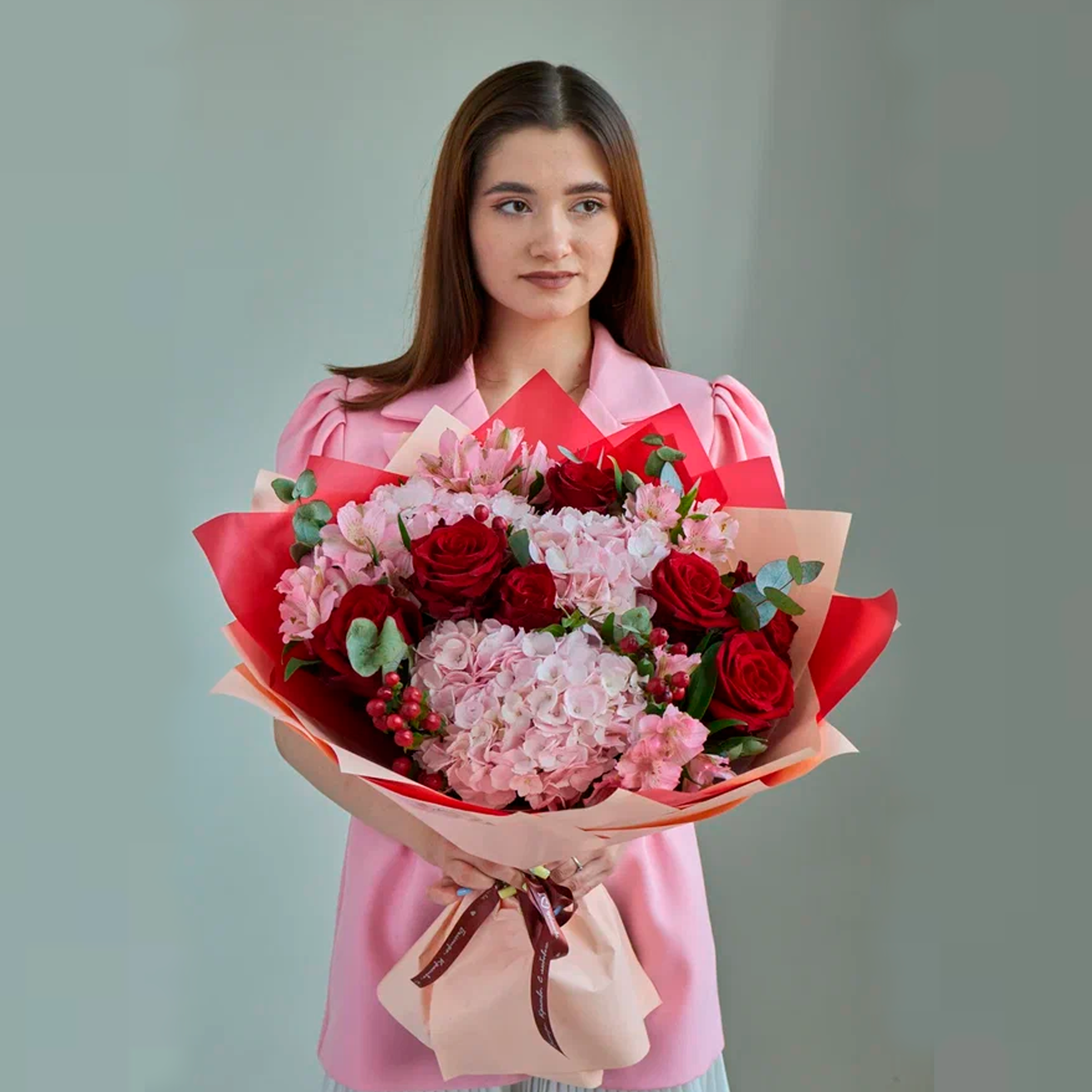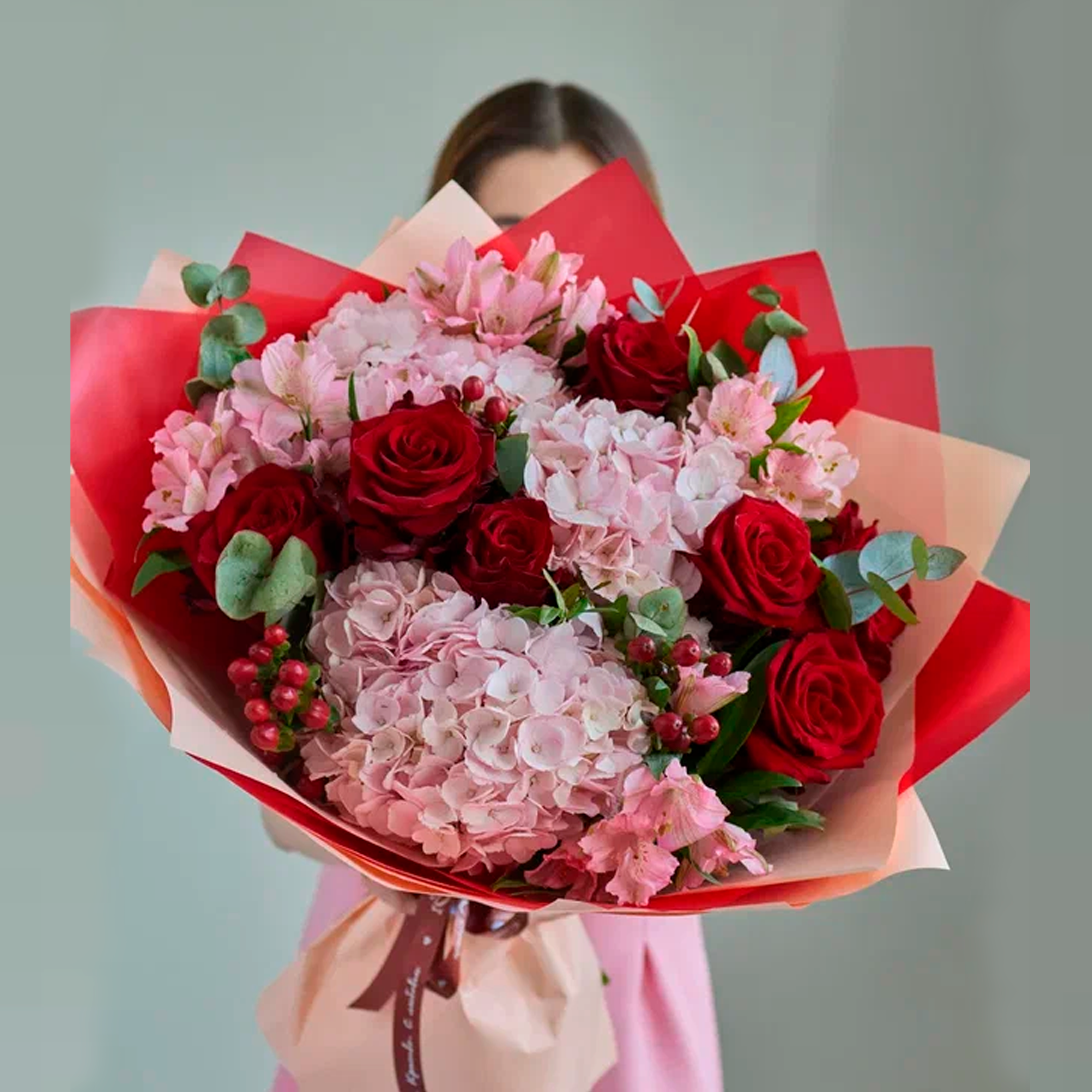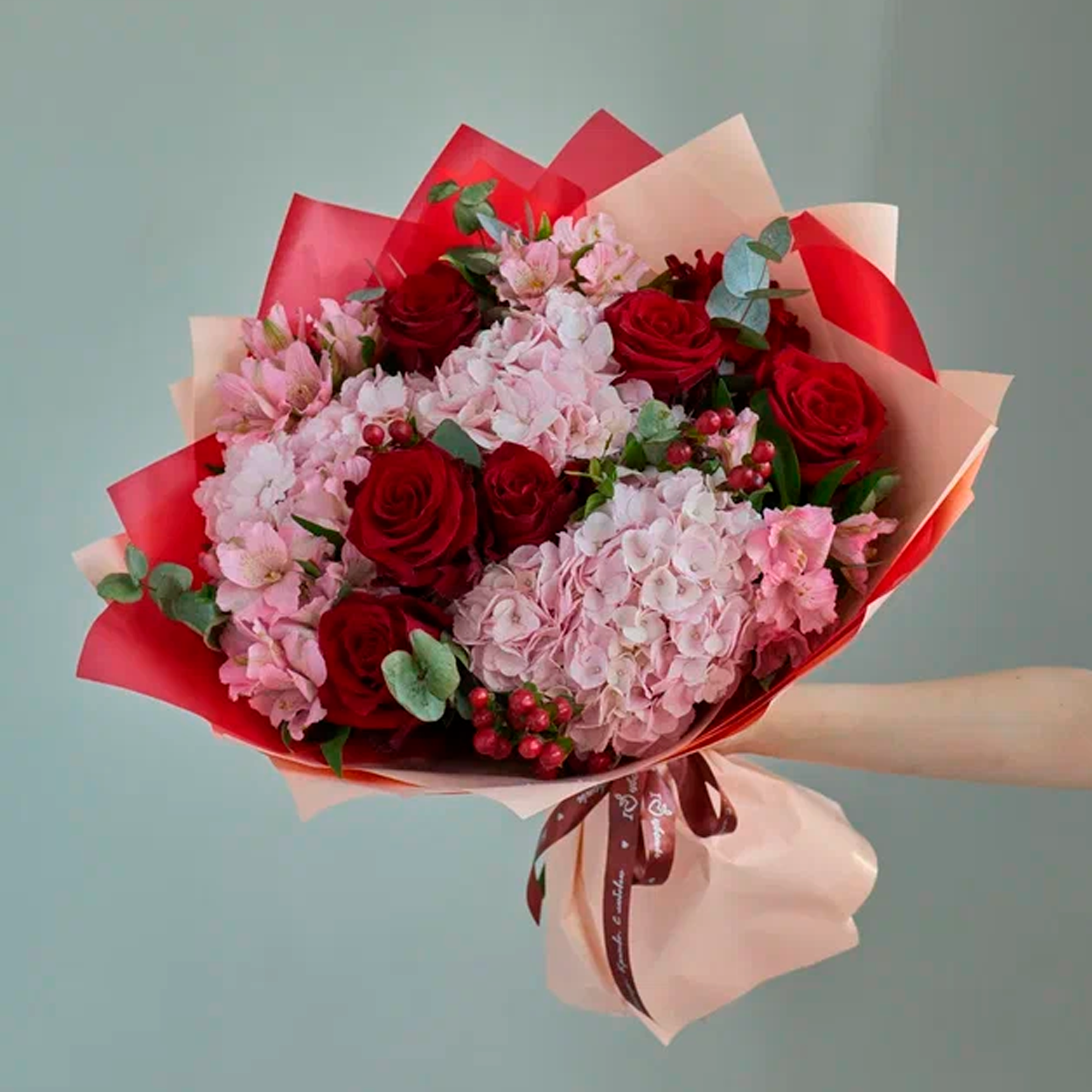 Букет из гортензий и красных роз N 84615