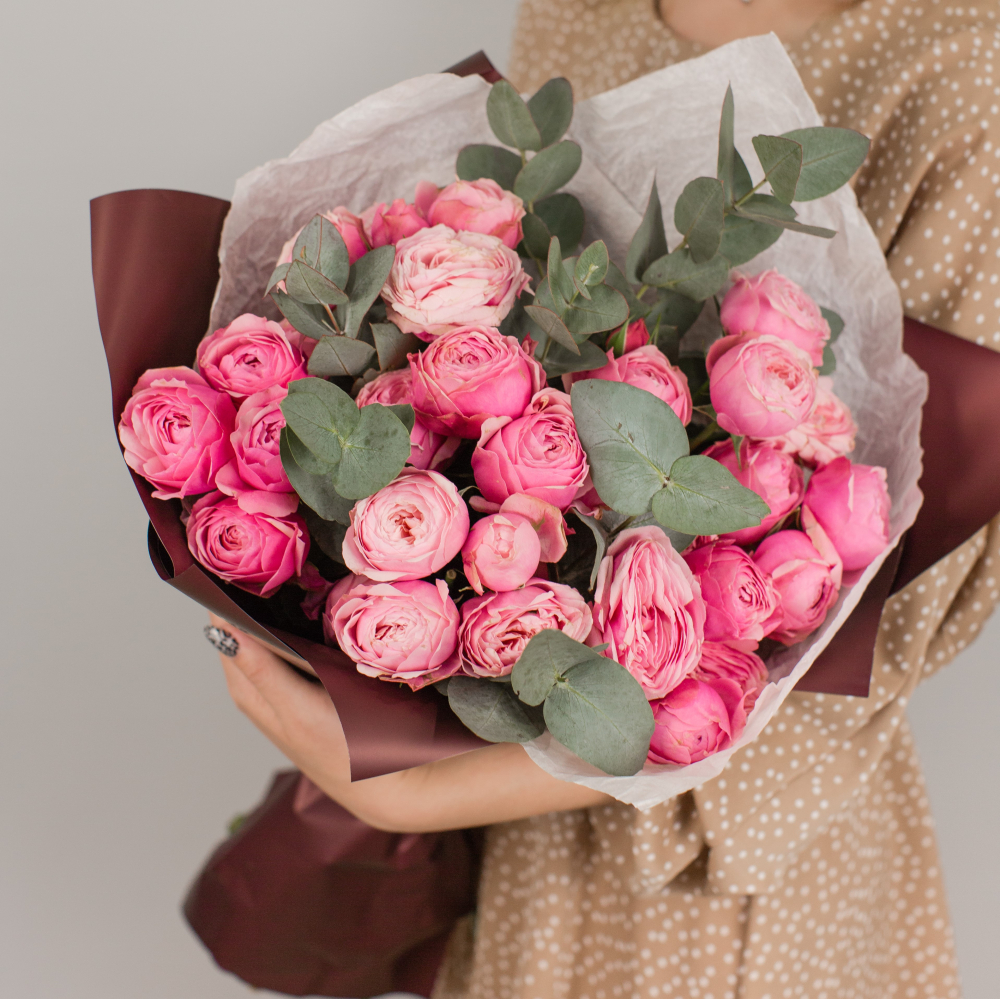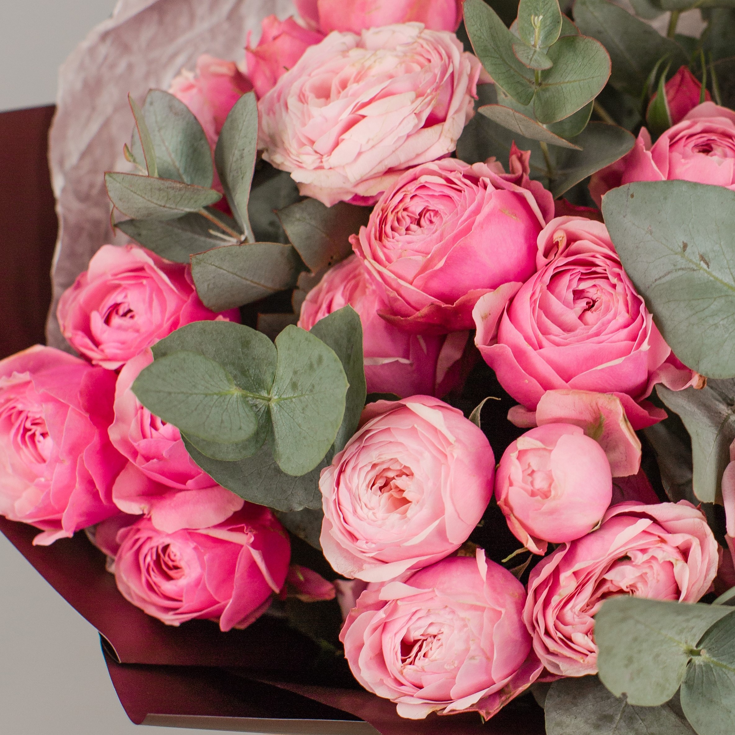 Букет из ярких кустовых пионовидных розовых роз с эвкалиптом арт. 50416